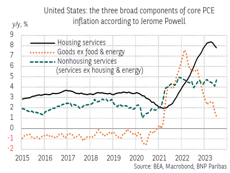杰羅姆·鮑威爾於2023年8月25日在傑克遜霍爾的開幕致辭中,對美國通脹進行了相當詳細的分析,特別關注了核心個人消費支出*通脹的三個主要組成部分,以跟踪通貨緊縮過程。此處轉載了說明他的評論的圖表。