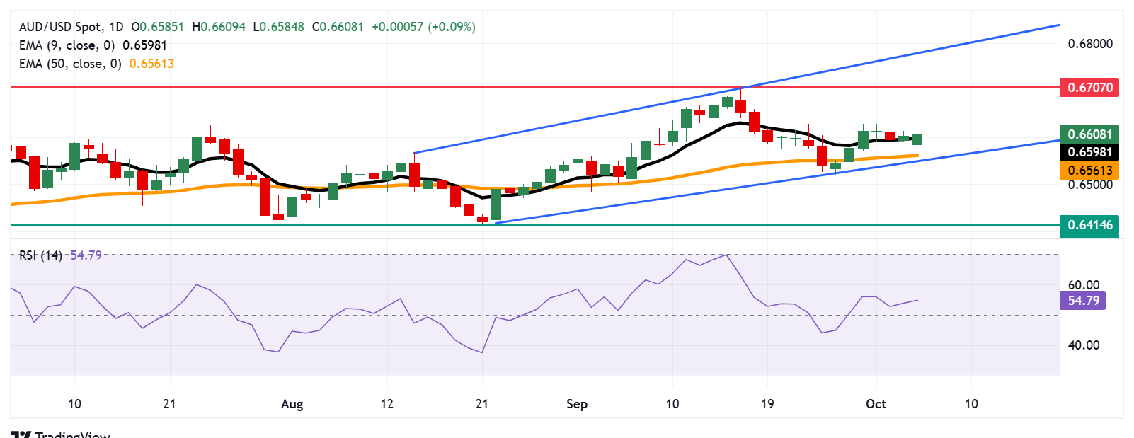 AUD/USD貨幣對在週一交易於0.6610附近。日線圖的技術分析表明,該貨幣對在上升通道內運行,顯示出看漲的偏向。此外,14天相對強弱指數(RSI)略高於50水平,進一步增強了看漲偏向。