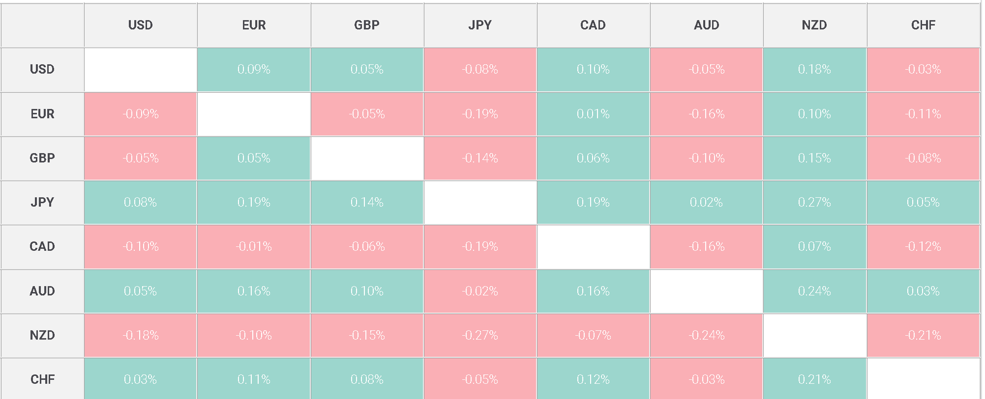 熱圖顯示了主要貨币對的波動百分比變化。基準貨币從左列中選取,報價貨币從頂行中選取。例如,如果投資者從左列選擇歐元,然後沿水平線移動到日元,方框中顯示的百分比變化即爲歐元/日元波動