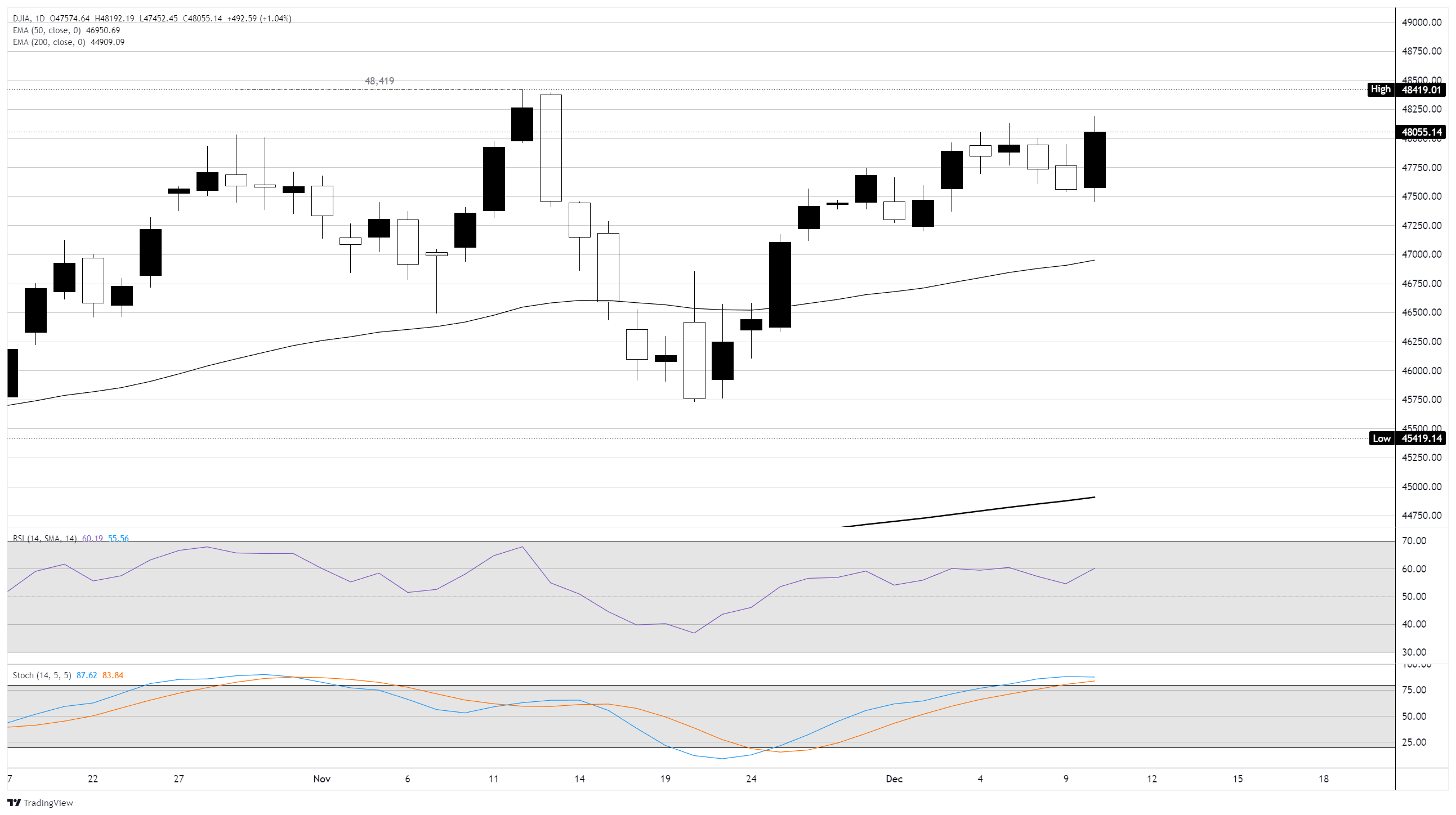 道瓊斯工業平均指數(DJIA)在週三上漲,此前美聯儲(Fed)連續第三次將基準利率下調25個基點,最高時道瓊斯上漲超過1.2%,並推動標普500指數上漲,而納斯達克則維持在平盤附近。此次降息將聯邦基金利率降低至3.50%–3.75%,並伴隨重新啟動短期債券購買,導致2年期國債收益率下降。市場解讀美聯儲對勞動力市場放緩的認可為其可能優先支持就業的信號,即使通脹仍然是一個擔憂。