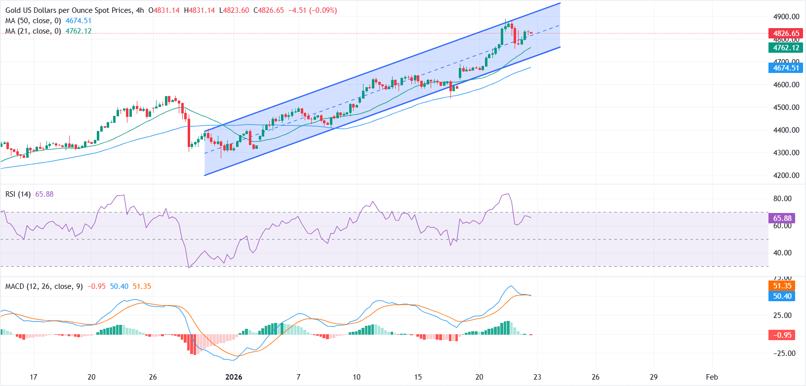 XAU/USD仍處於強勁的上升趨勢中,本月迄今價格上漲近11%,在2025年飆升約64%。在4小時圖上,黃金在一個明確的上升平行通道內交易,標誌著一系列更高的高點和更高的低點。價格舒適地位於21期和50期簡單移動平均線(SMA)之上,進一步鞏固了買方牢牢掌控的觀點。
