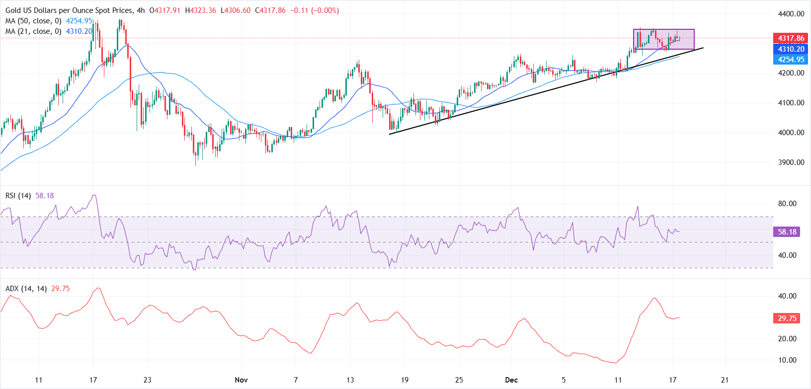 在4小時圖上,黃金/美元繼續在一個上升結構內交易,受到從11月中旬低點(約4,000美元)繪製的上升趨勢線的支撐。