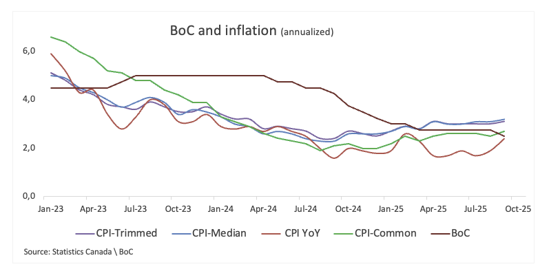 對於市場而言,整體CPI數據將是直接關注的焦點。但在BoC,注意力將集中在細節上:修剪、中位數和共同指標。前兩個指標一直保持在3.0%附近,令央行內部感到擔憂,而共同指標則略微下降,但仍高於央行的目標。