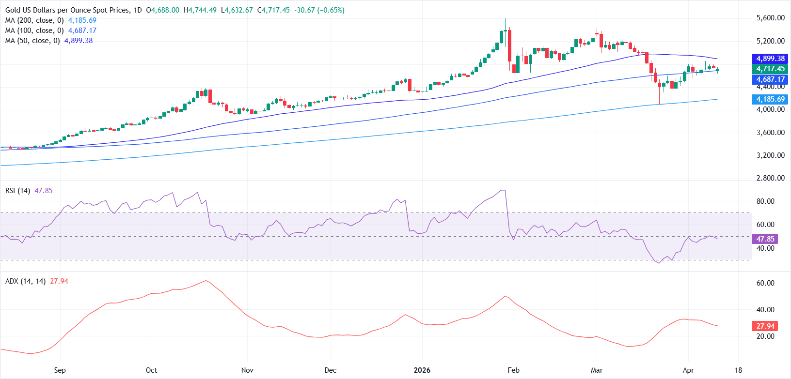 從技術角度看,日線圖顯示黃金/美元持穩於100日簡單移動均線(SMA)4687.17美元上方,且遠高於200日SMA約4185.69美元,但受制於50日SMA 4899.38美元下方。這使得整體偏向中性,略帶下行傾向,價格在這些關鍵水平間盤整。