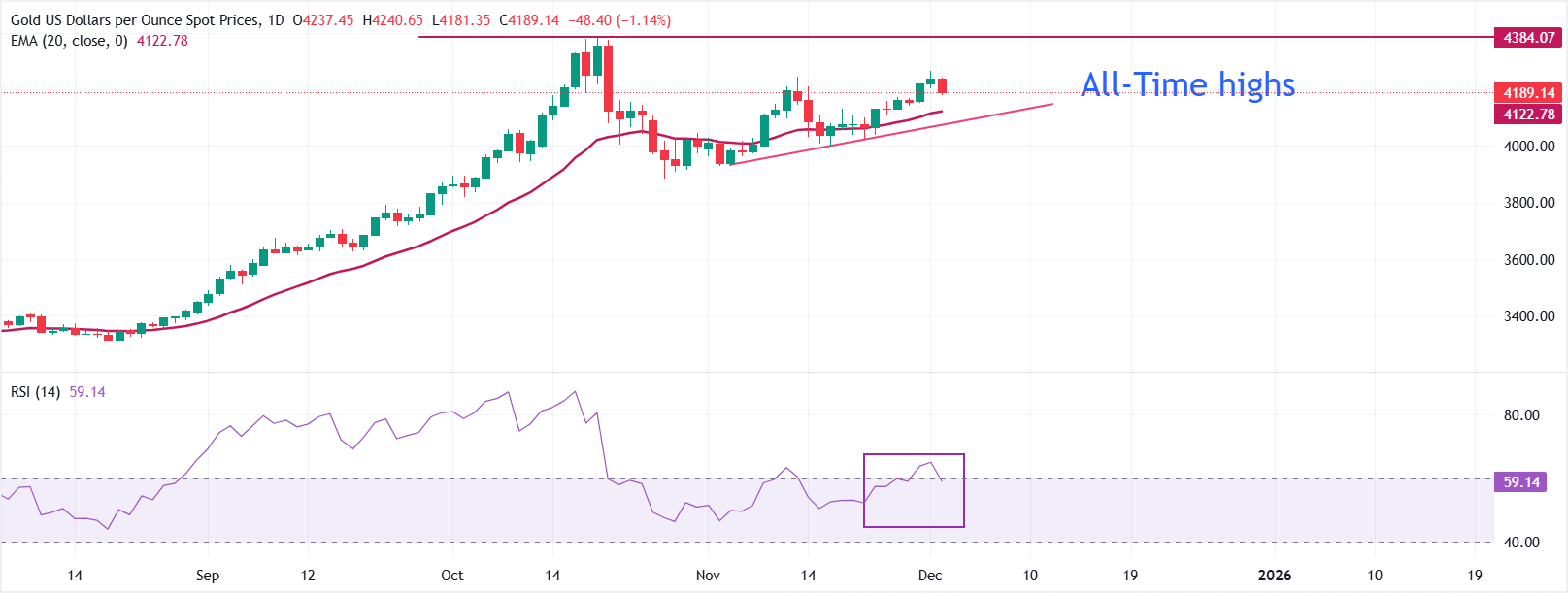 在日線圖上,黃金/美元在週二的歐洲交易時段交易於4180美元附近。20日指數移動平均線(EMA)在4122.78美元上升,價格保持在其上方以維持積極偏向。回調至該均線時將找到支撐,同時其斜率保持上升。相對強弱指數(RSI)為59,位於50以上,儘管從近期高點回落,但仍保持看漲動能。