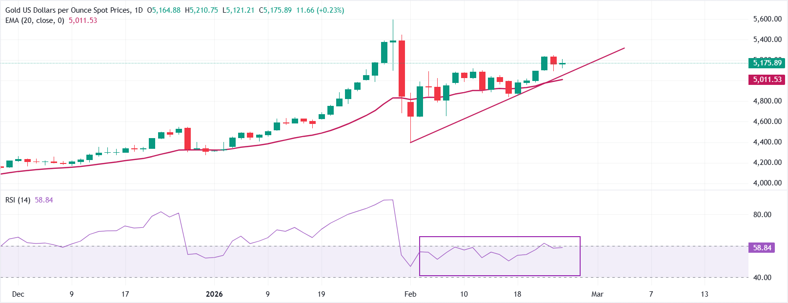 週三歐洲交易時段,金價(黃金/美元)上漲0.6%,接近5200美元。由於美國與伊朗之間因德黑蘭意圖建設核基礎設施而產生的緊張局勢,以及華盛頓貿易政策的不確定性,提升了對避險資產的需求,這種貴金屬獲得了上漲。