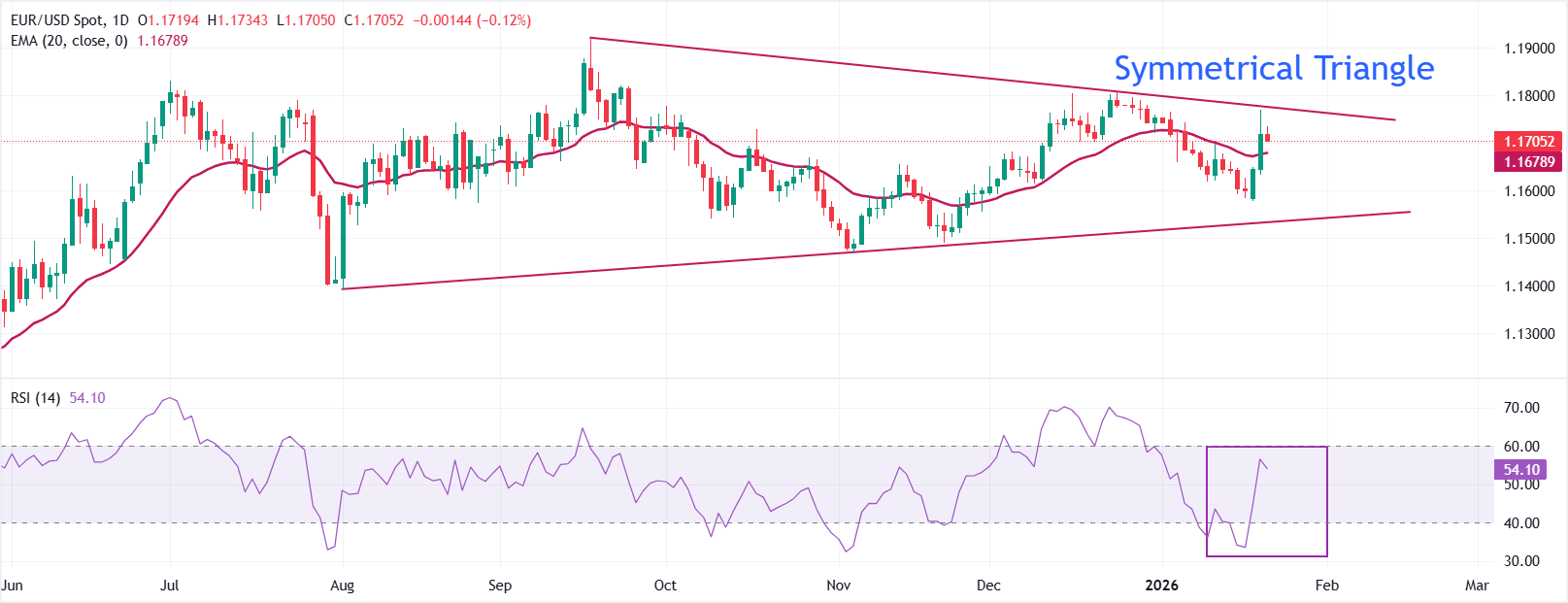 截至撰寫時,歐元/美元在1.1700附近交易。20日指數移動平均線(EMA)在1.1679,支撐短期偏向,略微上升。預計回調將在這一動態水平附近找到初步需求。