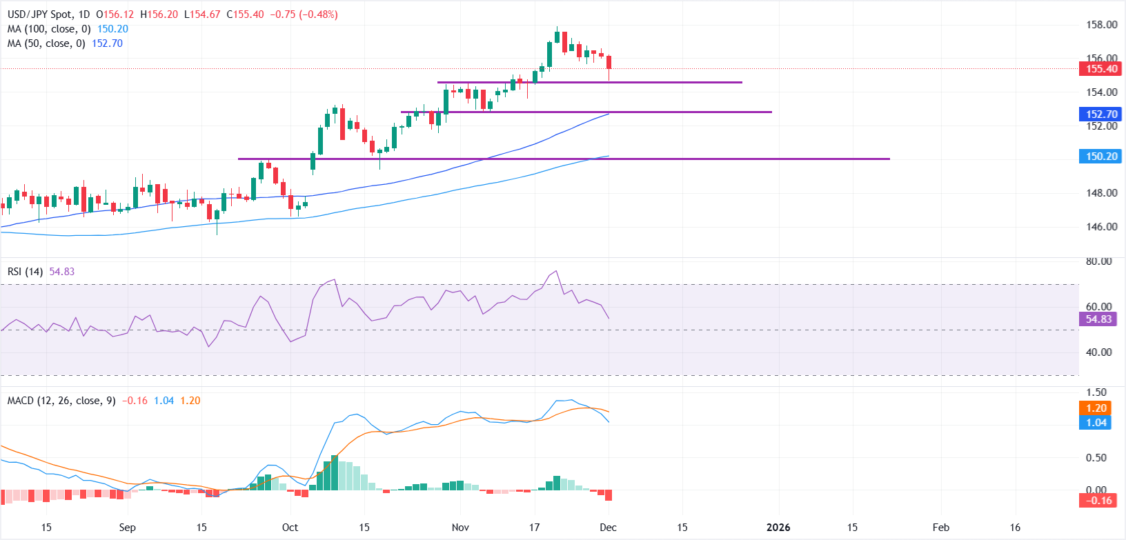 在下行方面,若果斷跌破154.50,將暴露出下一個支撐區間,即接近152.69的上升50日SMA,而100日SMA在150.20附近預計將在更深回調時提供更強的支撐。