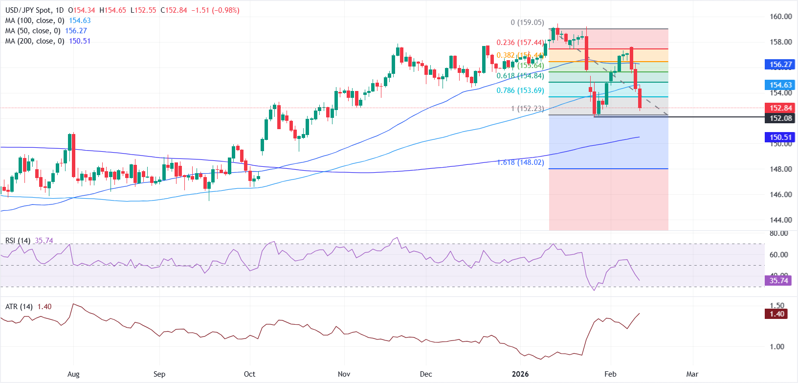 在下行方面,若清晰跌破152.00關口,將暴露出接近150.50的200日簡單移動均線(SMA)。若果斷跌破150.00,將加強看跌偏向,並為向148.00附近的1.618斐波那契回撤位的更深修正回調打開大門。