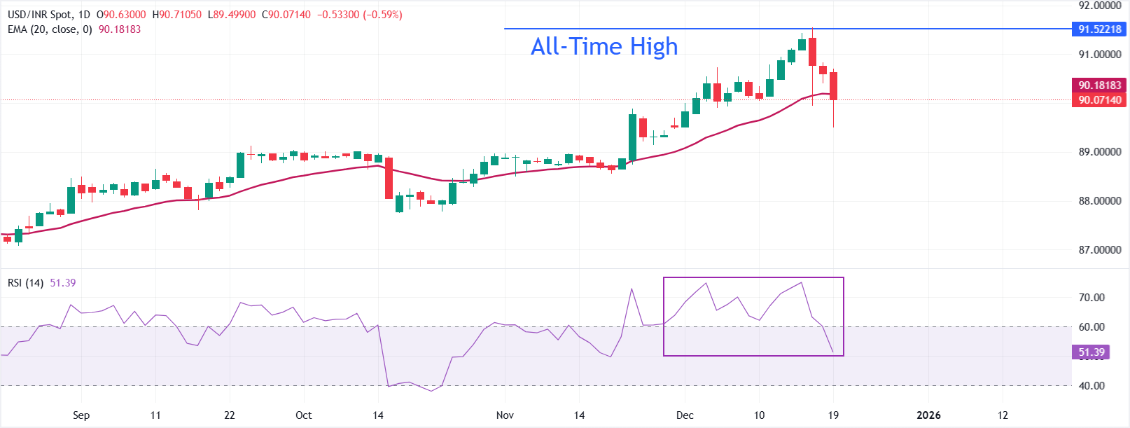 美元/印度盧比(USD/INR)在週五滑落至接近90.0714。價格略低於20日指數移動平均線(EMA),該均線在經過多週的上升後已趨於平坦。20日EMA在90.1818處限制了短期的上行空間,而之前的上升趨勢暫停。