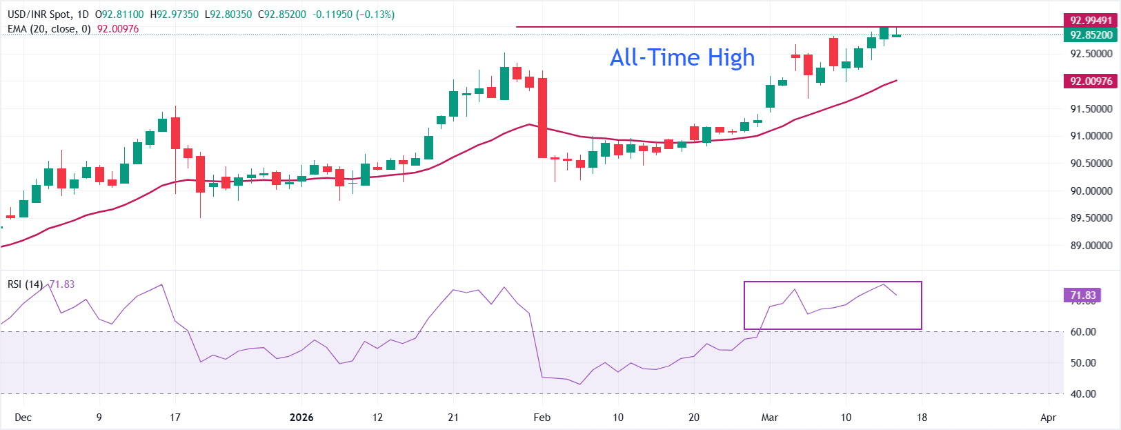 印度盧比(INR)在週一結束了對美元(USD)的四天上漲。美元/印度盧比(USD/INR)開盤走低至約92.80,因為美元的反彈在霍爾木茲海峽可能很快重新開放的猜測中暫停。