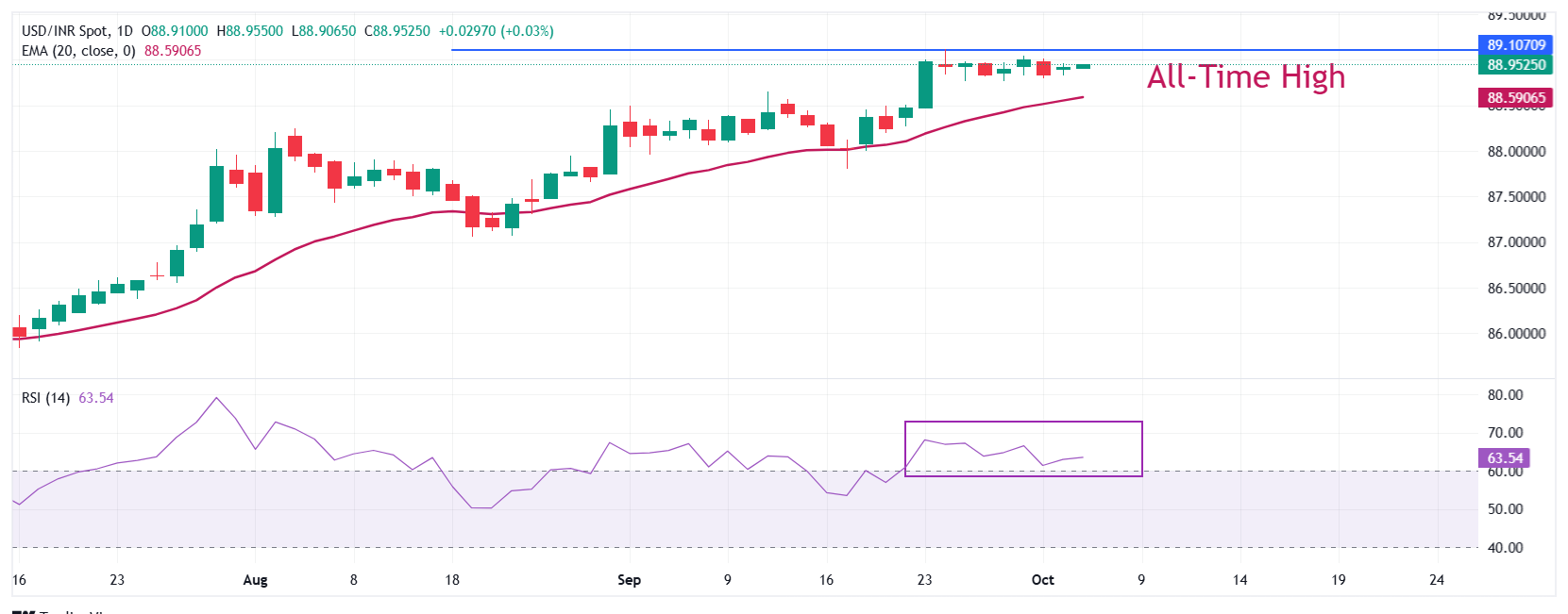 印度盧比(INR)在週一以88.90的平穩開盤,對美元(USD)保持穩定。美元/印度盧比(USD/INR)匯率總體堅挺,仍接近9月24日創下的89.12的歷史高點。