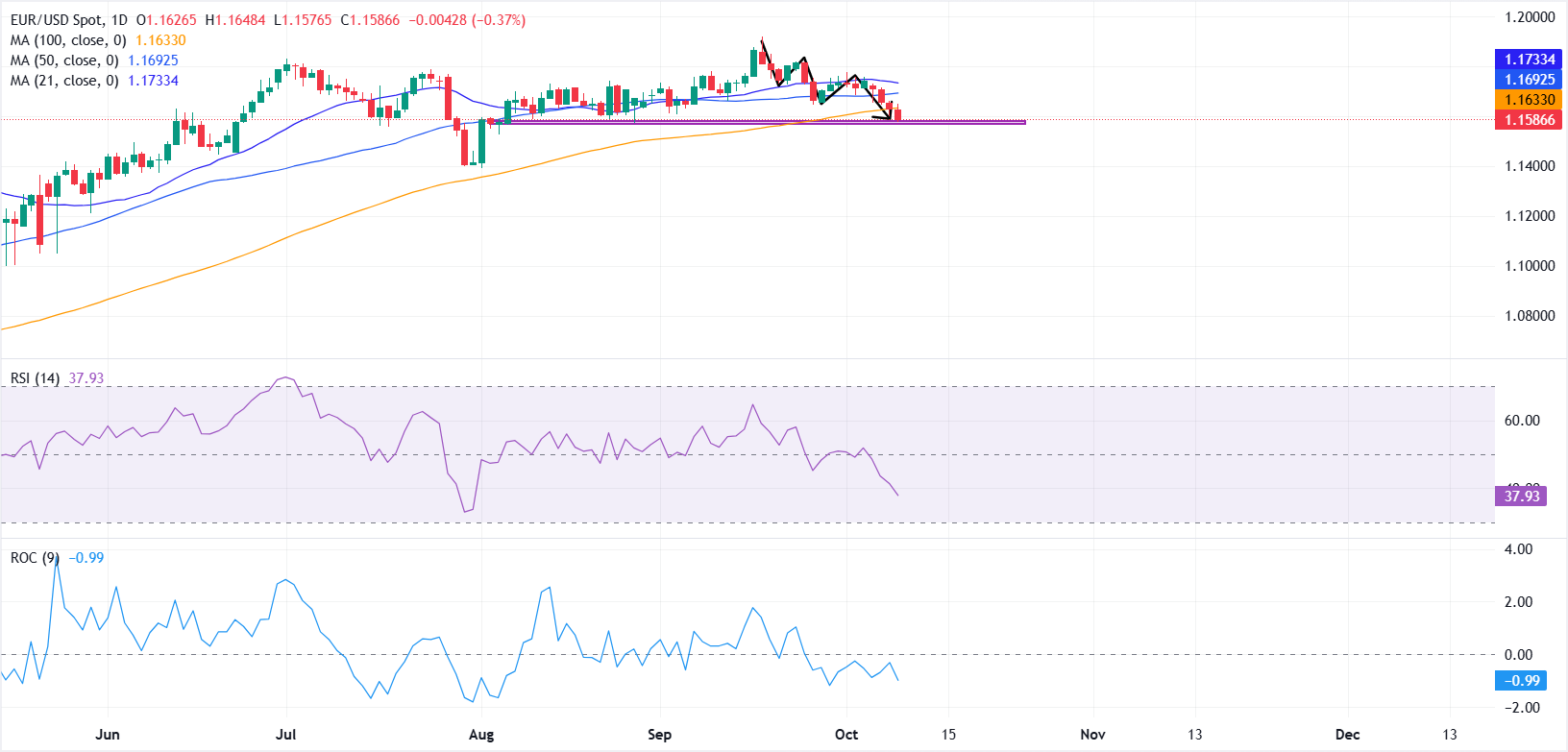 從技術上看,自9月17日觸及1.1918高點以來,歐元/美元已明顯轉為看跌,形成了一系列明顯的低高和低低。該貨幣對目前交易於其21日、50日和100日簡單移動均線(SMA)下方,分別為1.1735、1.1692和1.1633,進一步強化了下行偏向。