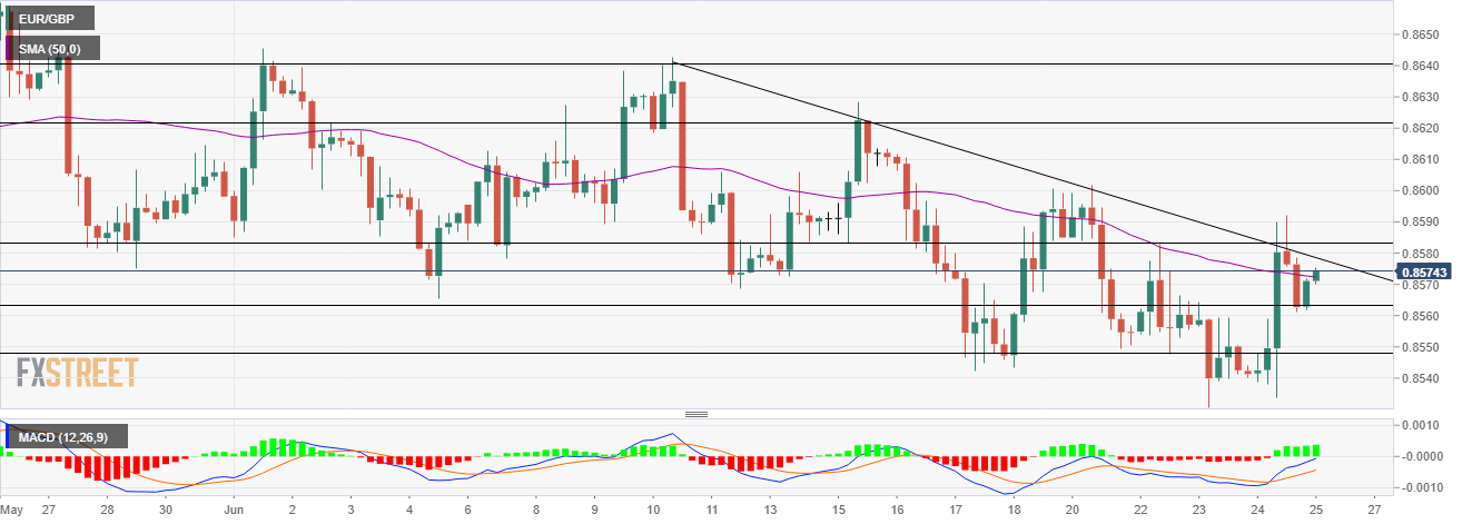 4 小時圖顯示,歐元/英鎊叉盤自創下 0.8642 高點以來維持回落。數個頂部構成關鍵水平。自上述水平以來的下降趨勢構成阻力。
