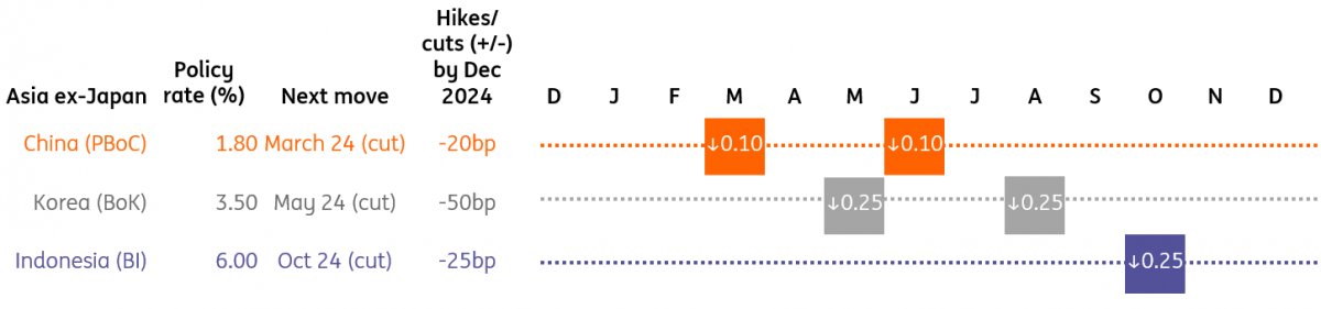 日本央行走向正常化的第一步將是取消其殖利率曲線控制計劃,這可能會在2024年第一季發生,屆時日本國債將跟隨美國市場的走勢跌至低於1%的水平。在日本央行確認了春季薪資談判的結果後不久,央行可能會在第二季升息10個基點,但在年底前將短期政策利率維持在0.0%。