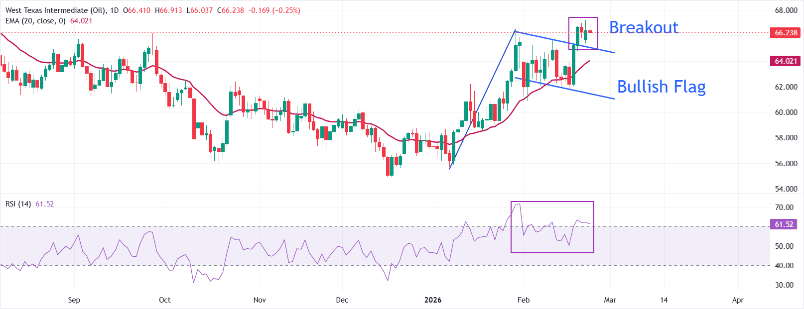 截至撰寫時,WTI美國原油價格在66.30美元附近交易。然而,短期偏向略顯看漲,因為價格保持在看漲旗形圖形的突破之上,該圖形限制了大約61.30美元至64.90美元之間的波動。