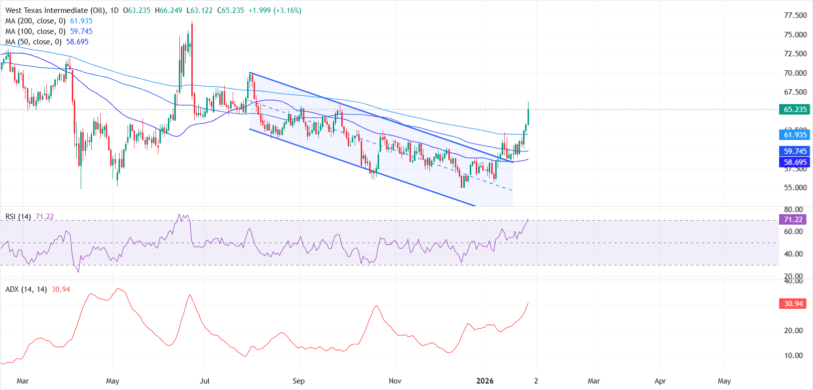 從技術角度來看,日線圖已轉為積極,WTI 明確突破了下降通道,並重新奪回了關鍵移動平均線。