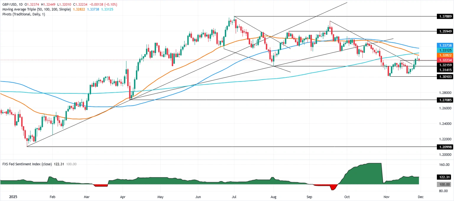英鎊/美元在週四保持在1.3230附近穩定,市場參與者在流動性稀缺的情況下消化英國的秋季預算,因美國市場因感恩節假期而關閉。撰寫時,該貨幣對在1.3232平盤,幾乎沒有變化。閱讀更多...