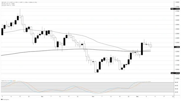 英鎊/美元在週二回落至中間區間,因在1.3350水平遭遇日內技術性拒絕,回落約0.2%。價格走勢已回落至1.3300附近,並在接近1.3250的長期200日指數移動均線(EMA)上方保持。市場正為2025年最後一次美聯儲(Fed)利率決策做準備。