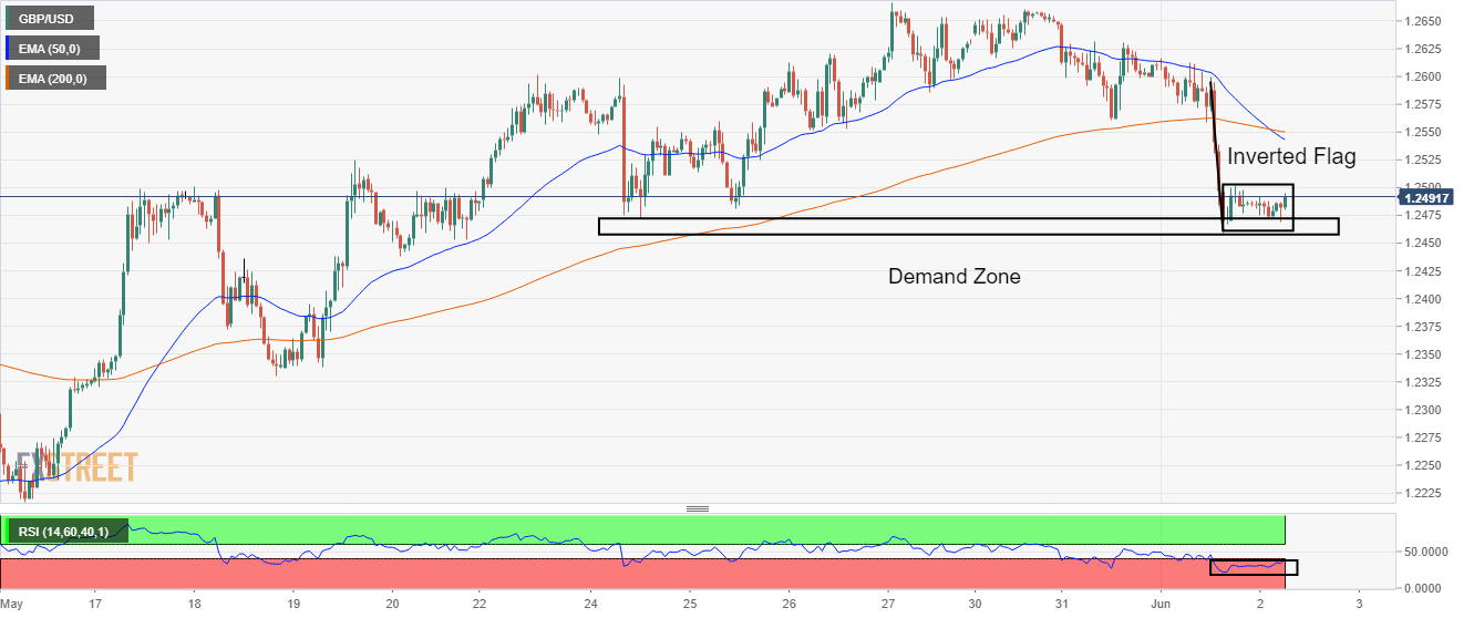 從一小時圖級別看,英鎊兌美元形成了一個倒轉旗形形態,表明匯價區間波動後將進一步下跌。通常情況下,倒轉旗形形態表明投資者開始做空,他們傾向在建立下行傾向後執行頭寸。英鎊目前徘徊於1.2548-1.2570的需求區域附近。