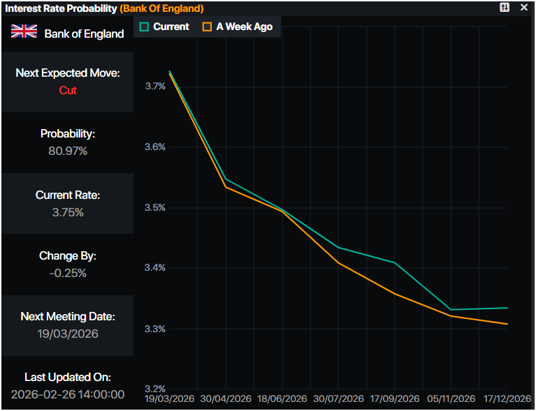 根據Prime Market Terminal的數據,貨幣市場已為3月19日的英國央行會議定價了81%的降息概率。