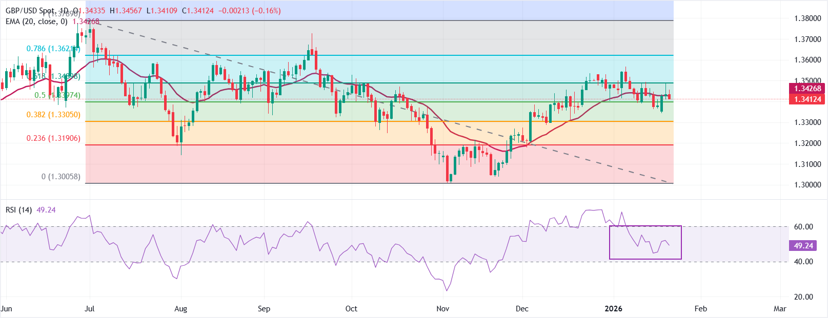 截至發稿時,GBP/USD交易價格接近1.3405。價格略低於20日指數移動平均線(EMA)1.3429,該均線在穩步上升後已趨於平坦,顯示出盤整信號。