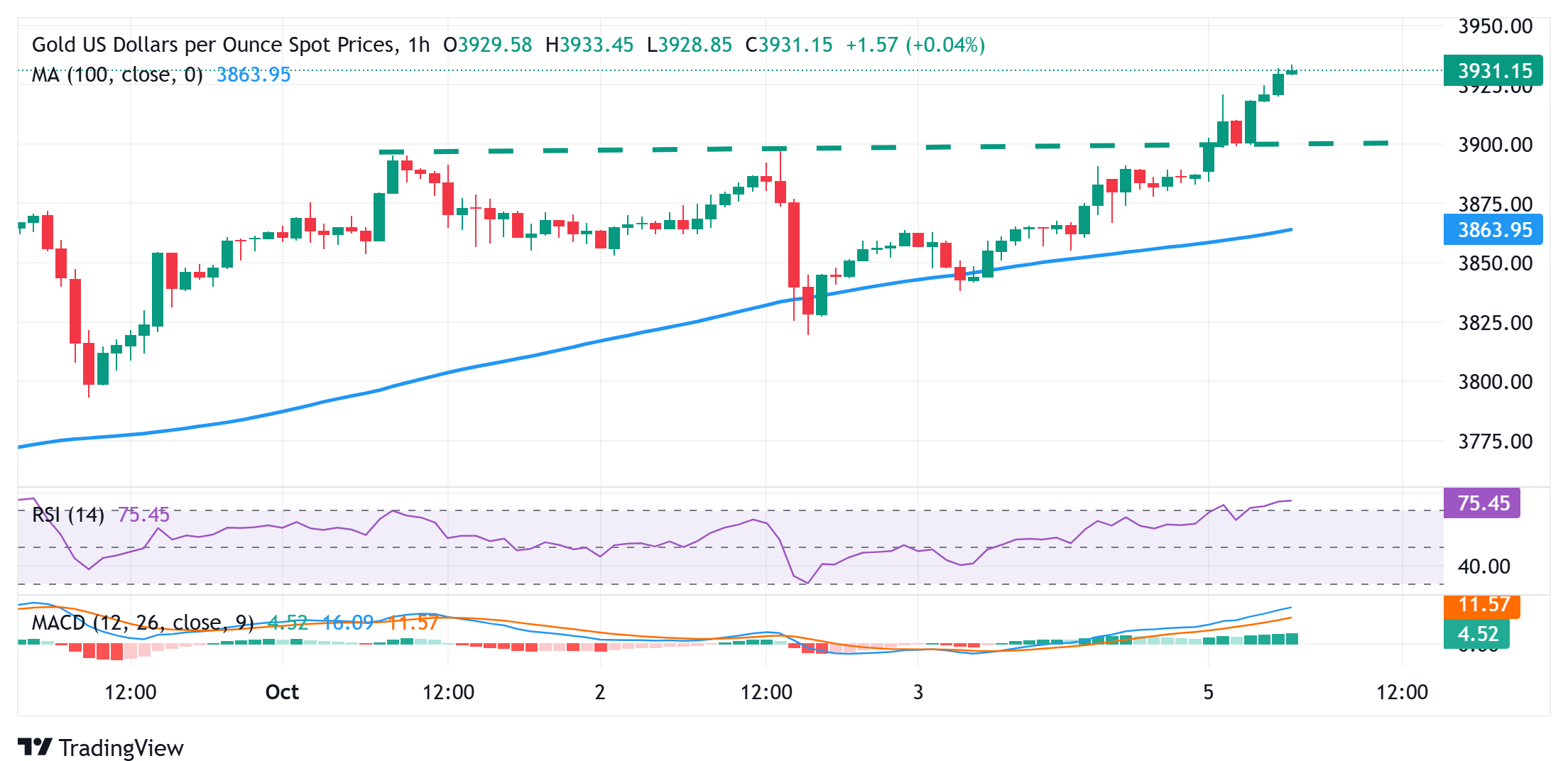 從技術角度來看,週一突破3900美元關口的強勁上漲可視為XAU/USD多頭的新觸發點,並驗證了短期的積極前景。然而,日線相對強弱指數(RSI)保持在70以上,閃爍超買信號,需謹慎對待以便在進一步獲利前進行定位。